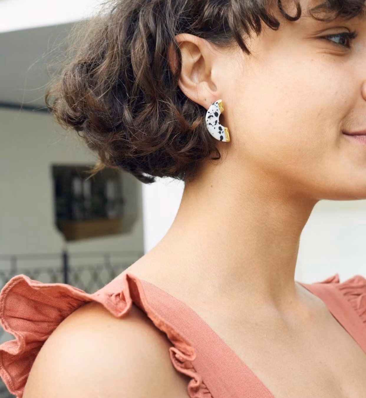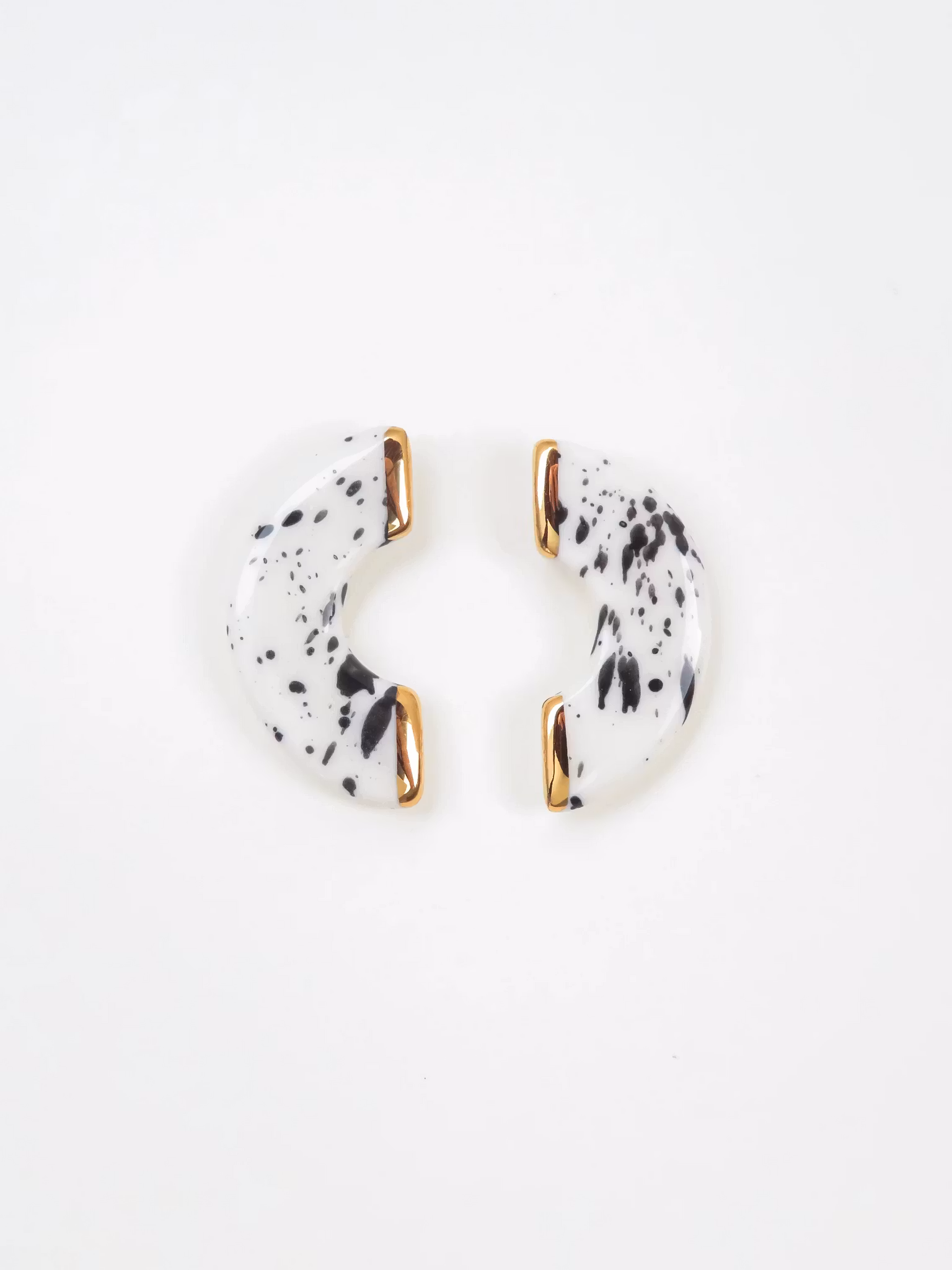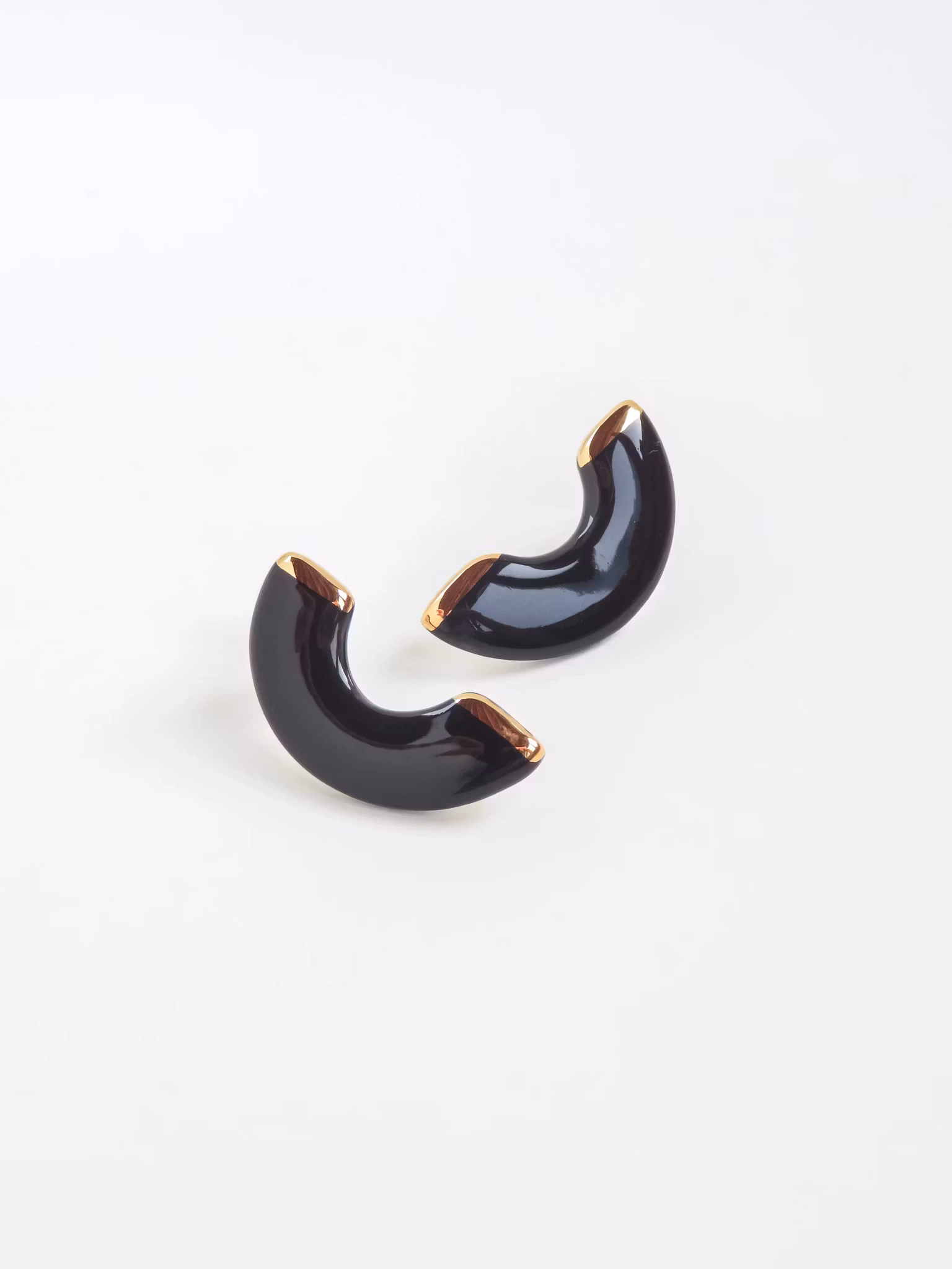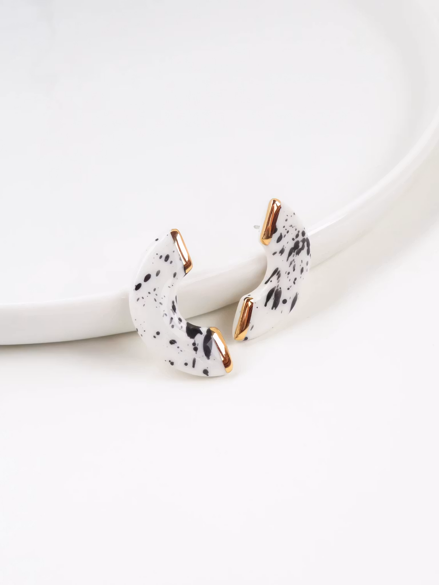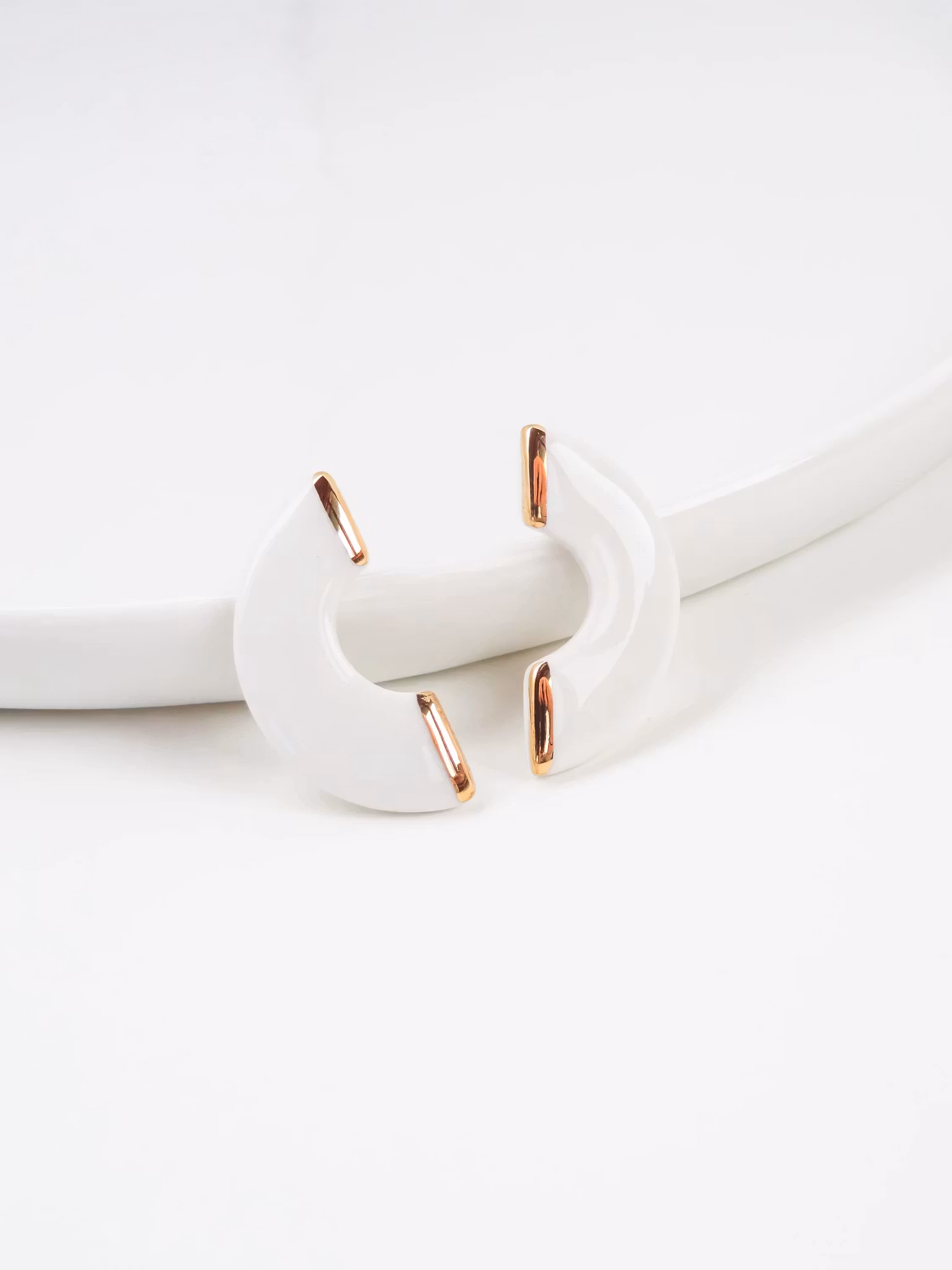 Handgjorda halvmåneformade örhängen, målade med 18k guldlyster. Ungefärlig storlek är 1 cm bred och 3 cm lång. Örhängesstolpar är i sterlingsilver. Nickelsäkra.